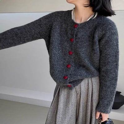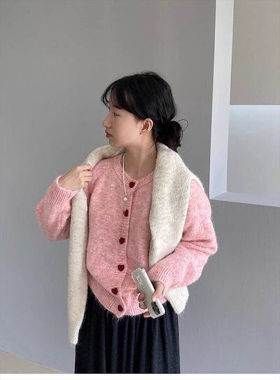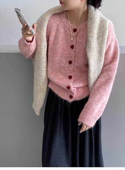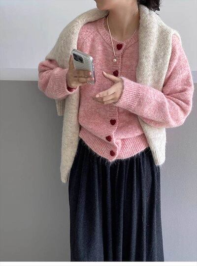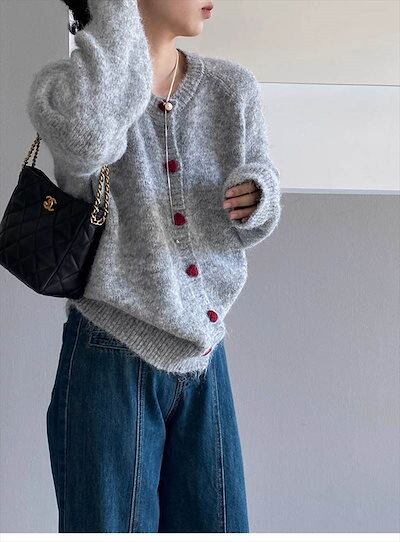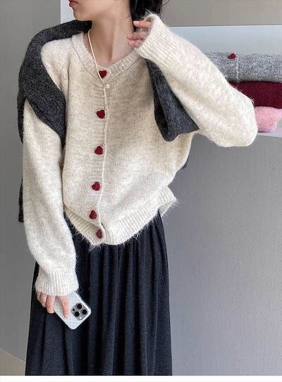 クーポン有トップス レディース ニット セーター 秋 冬 普通丈トップス 長袖 クルーネック 丸首 襟なし 前開き ハート型ボタン カラバリあり グレー アプリコット レッド ピンク ダークグレー 無