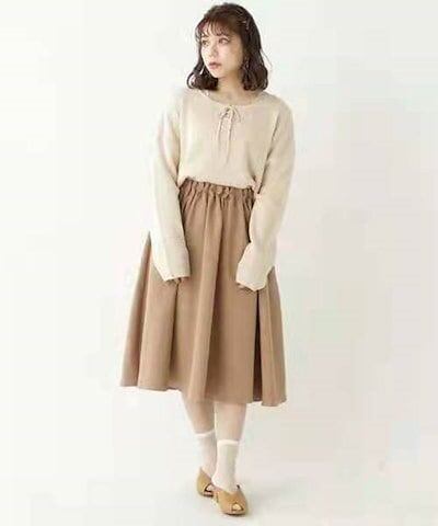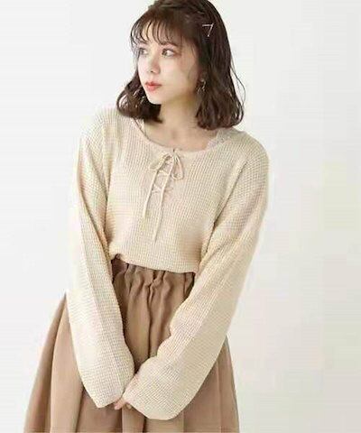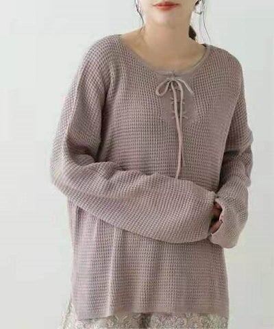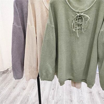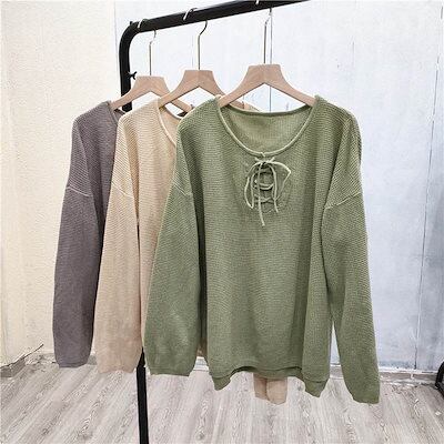 クーポン有ラウンドネック プルオーバー トップス レディース 個性的 春 秋 ミドル丈 普通丈トップス 裾イン 長袖 萌袖 Uネック 襟なし 鎖骨きれい セミフレア リボン 編み込み 透け感 カラバリ
