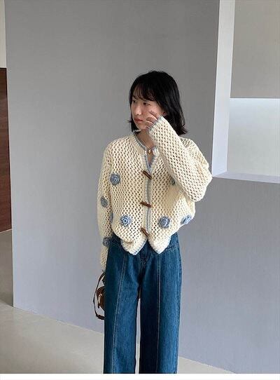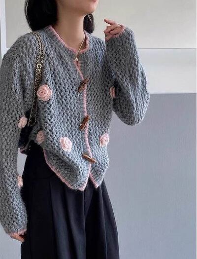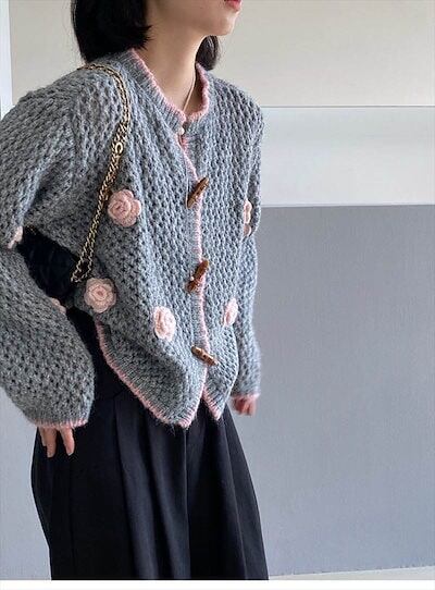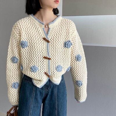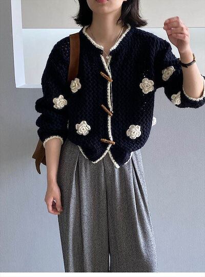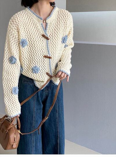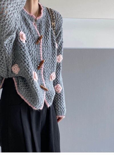 クーポン有カーディガン トップス レディース 個性的 秋 冬 普通丈トップス 長袖 クルーネック 丸首 襟なし 前開き 編み込み 立体的 カラバリあり ブラック グレー オフホワイト 花柄 フラワー