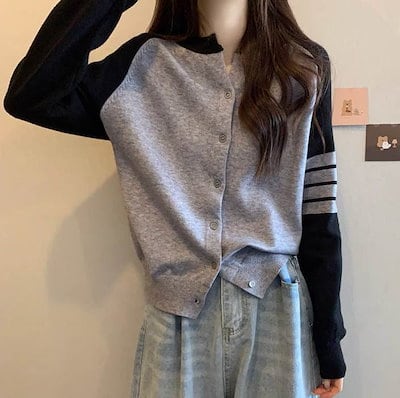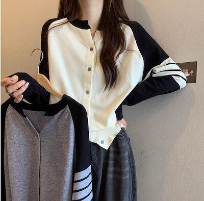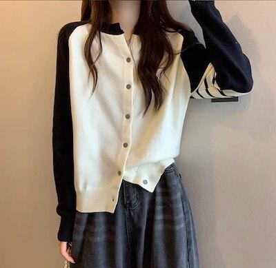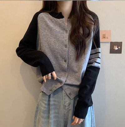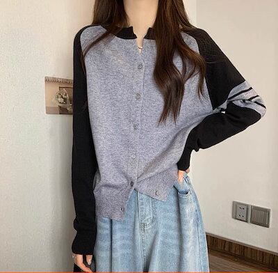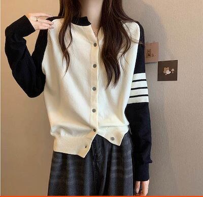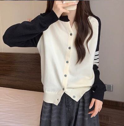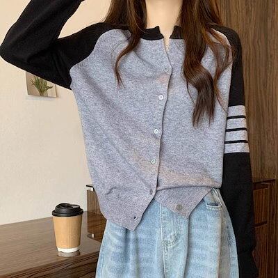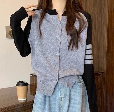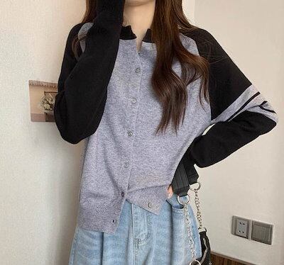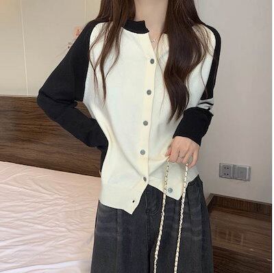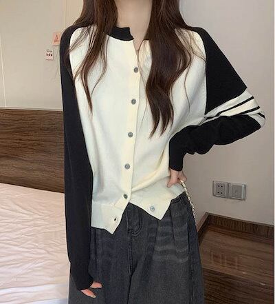クーポン有クルーネック カーディガン トップス レディース ニット セーター 個性的 春 秋 ミドル丈 長袖 二の腕カバー 萌袖 丸首 襟なし 切り替えデザイン 前開き 伸縮性 ボタン カラバリあり