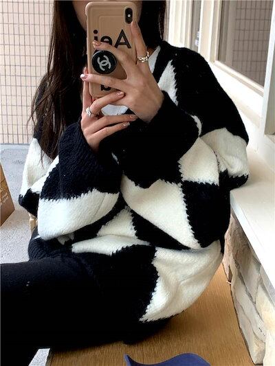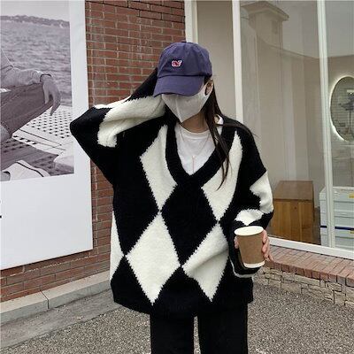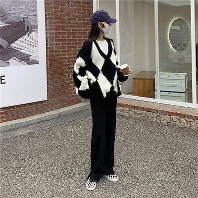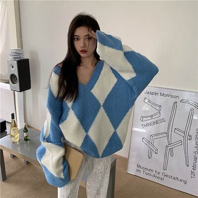 クーポン有 Vネック ニット トップス レディース お尻カバー 裾ワイド 長袖 ボリューム袖 襟なし 鎖骨きれい BIGシルエット オーバーサイズ ダボダボ カラバリあり ブラック 黒 ブルー 柄あり