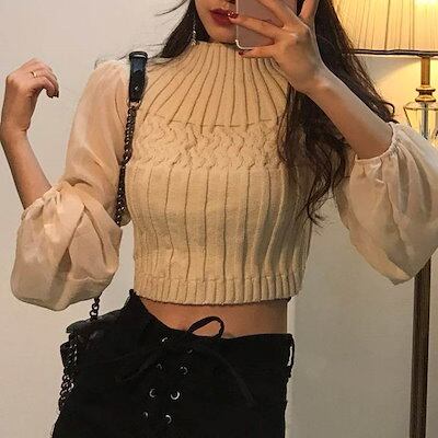 クーポン有異素材MIX ショート丈 トップス レディース セーター 個性的 春 秋 ミニ 長袖 シアー袖 萌袖 ボリューム袖 ハイネック 襟なし シフォン 透け感 伸縮性 カラバリあり ブラック ホワ