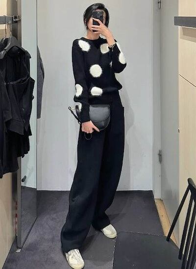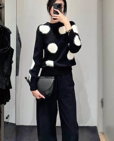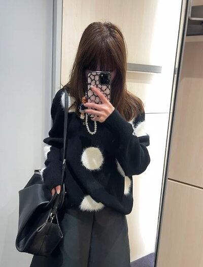 クーポン有トップス レディース ニット セーター プルオーバー 春 普通丈トップス 長袖 ラウンドネック 襟なし ノーカラー ストレート ふっくら 伸縮性 ブラック 黒 ドット柄 水玉 XS SS S