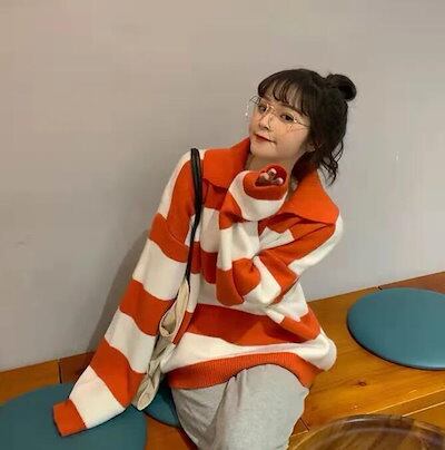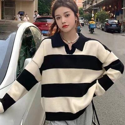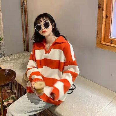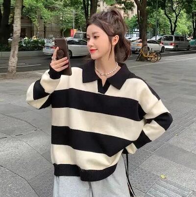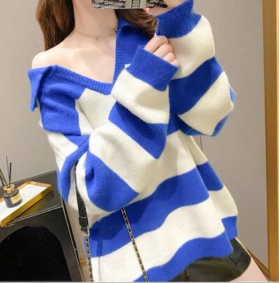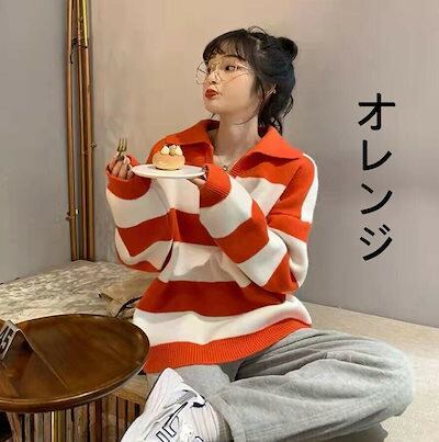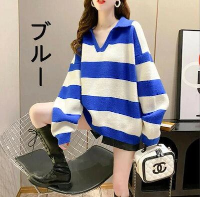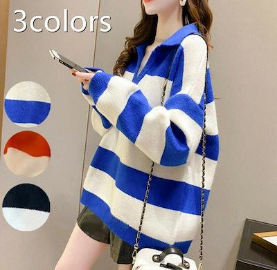 秋 冬 春 黒 カジュアル 大きいサイズ 保温 ボーダー柄 プルオーバー 長袖 襟 セーター トップス レディース