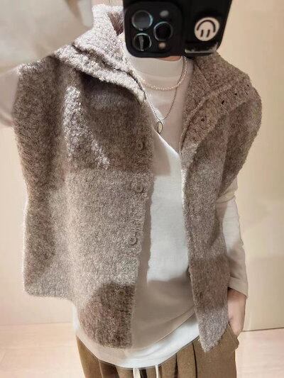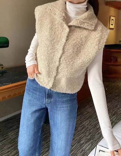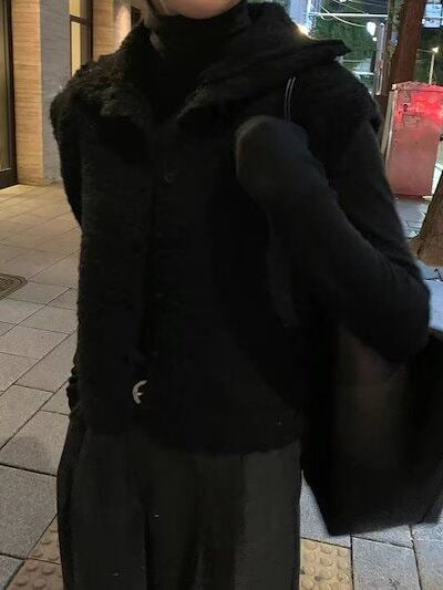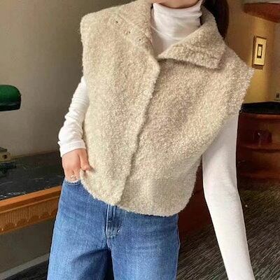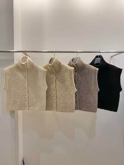 ニットベスト レディース ファーベスト 立ち襟 シャギーベスト ショート丈 ベスト ニット ジレ 前開き ふんわり 秋冬 ノースリーブ 無地 カジュアル お洒落 暖かい 防寒 レイヤード