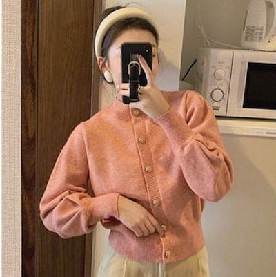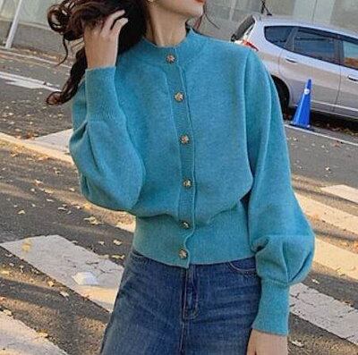 クーポン有カーディガン 短丈トップス レディース ニット 春 秋 冬 ショート丈 裾短め 長袖 二の腕カバー バルーン袖 ふわ袖 パフスリーブ クルーネック 丸首 襟なし ノーカラー セミタイト 前開