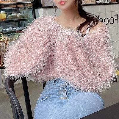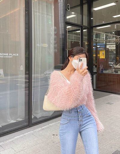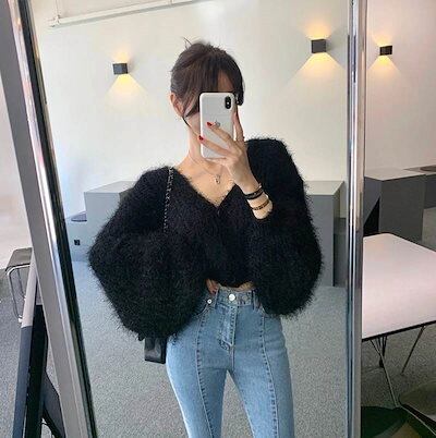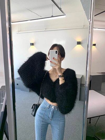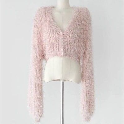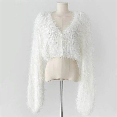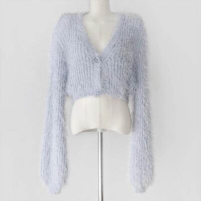 クーポン有ショート丈 ニット カーディガン アウター レディース 個性的 春 秋 ミニ 長袖 萌袖 Vネック 襟なし Iライン 羽織り 前開き ボタン カラバリあり ブラック ホワイト ピンク ブルー