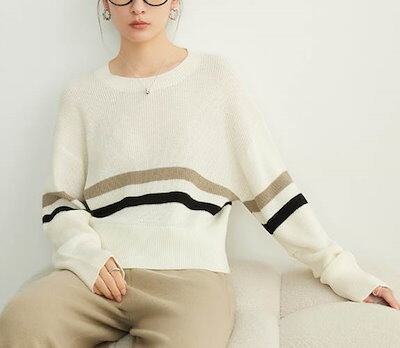 クーポン有ボーダー フリーサイズ セーター プルオーバー 秋 冬 普通丈トップス トップス レディース 長袖 クルーネック 丸首 襟なし ホワイト 白 柄あり ワンサイズ ウール 旅行 外出 1枚で決