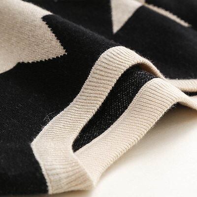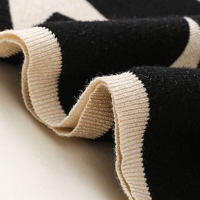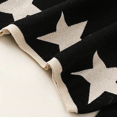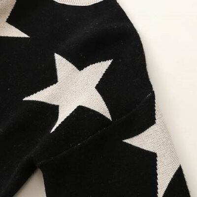 クーポン有星 スター柄 ニット セーター トップス レディース 個性的 秋 冬 ミドル丈 長袖 萌袖 クルーネック 丸首 襟なし 伸縮性 ブラック 柄あり サイズ S M L リブ 学校 職場 バイト
