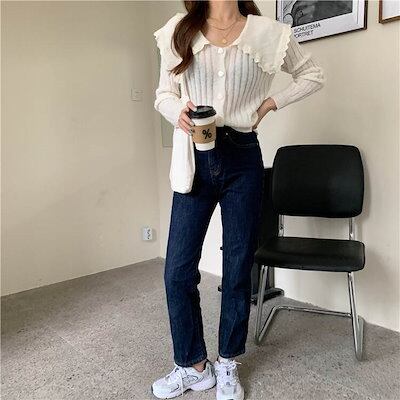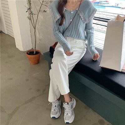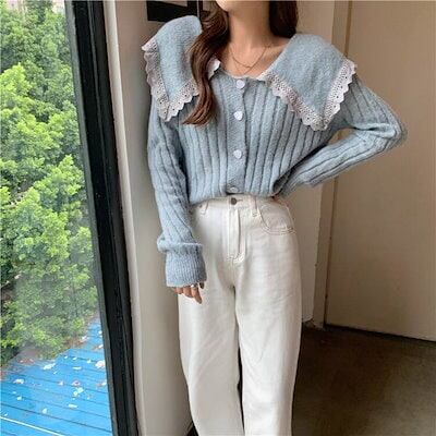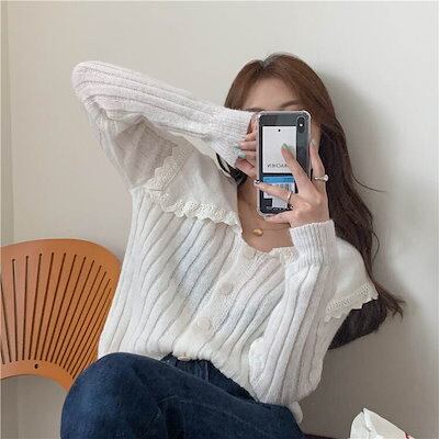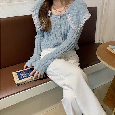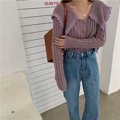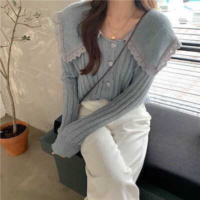 クーポン有Vネック デカ襟 セーター トップス レディース ニット 個性的 秋 冬 普通丈トップス 長袖 萌袖 ラウンドネック 襟付き 前開き レース 伸縮性 ボタン カラバリあり ホワイト ブルー