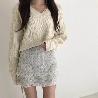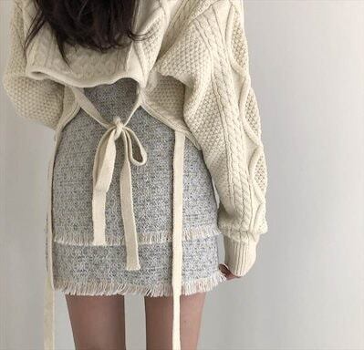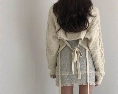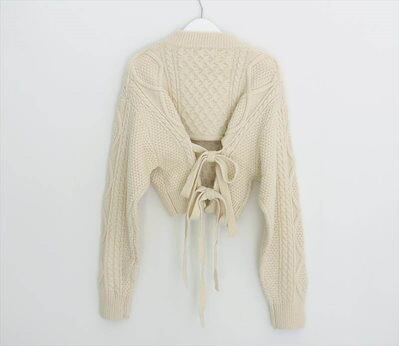 クーポン有バックコンシャス ケーブルニット トップス レディース ニット セーター プルオーバー 個性的 秋 冬 ショート丈 長袖 萌袖 ボリューム袖 Vネック 襟なし BIGシルエット リボン 伸縮