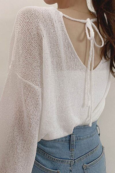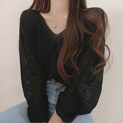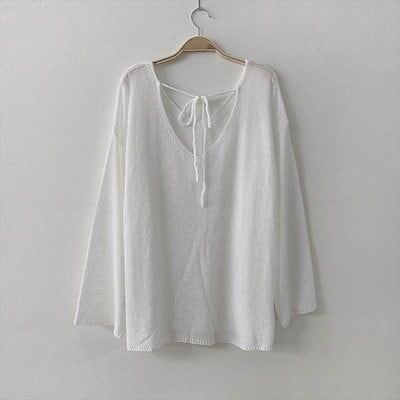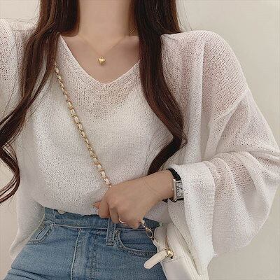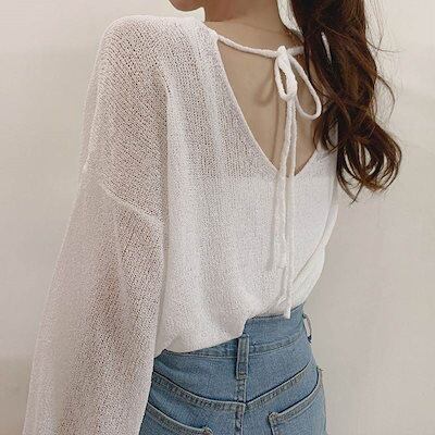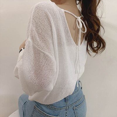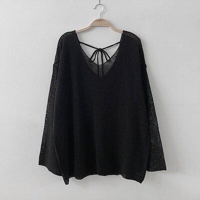 クーポン有レイヤード サマーニット トップス レディース プルオーバー 個性的 春 夏 秋 裾イン 長袖 萌袖 ボリューム袖 Vネック 襟なし リボン 透け感 シアー 伸縮性 カラバリあり ブラック