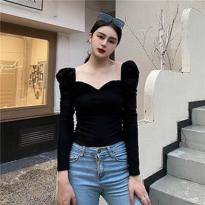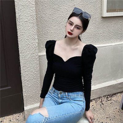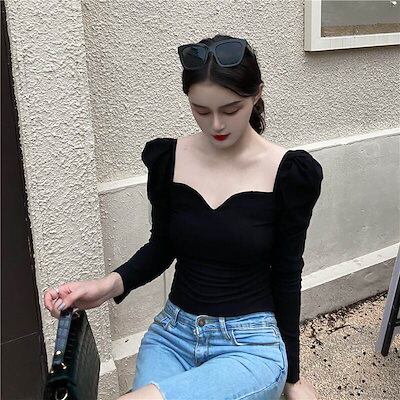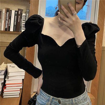 クーポン有パフスリーブ ニット トップス レディース カットソー プルオーバー 個性的 春 秋 冬 ショート丈 裾イン 長袖 Vネック ハートカット 襟なし デコルテきれい スリム タイト ストレート
