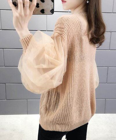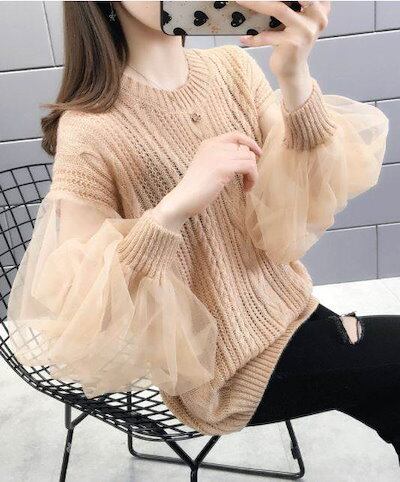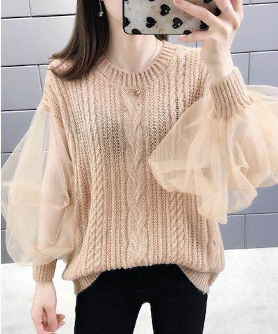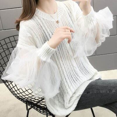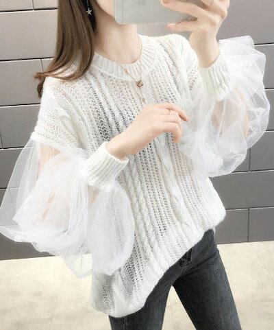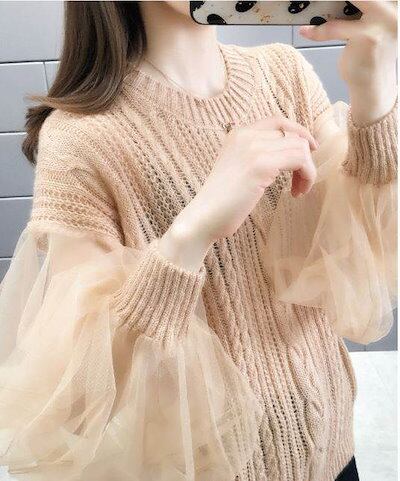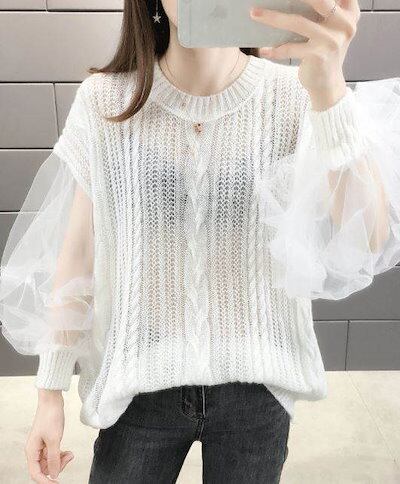 クーポン有ドロップショルダー ニット トップス レディース 個性的 春 秋 長袖 ボリューム袖 クルーネック 丸首 襟なし ドッキング シフォン 透け感 切り替えデザイン 伸縮性 カラバリあり ホワイ