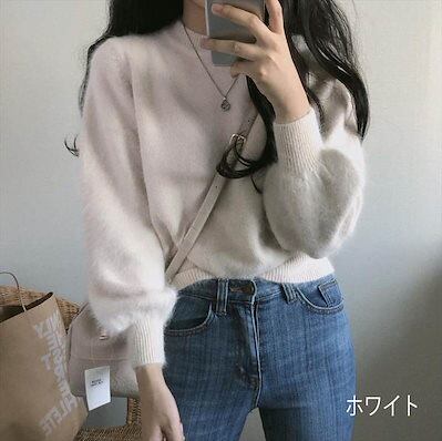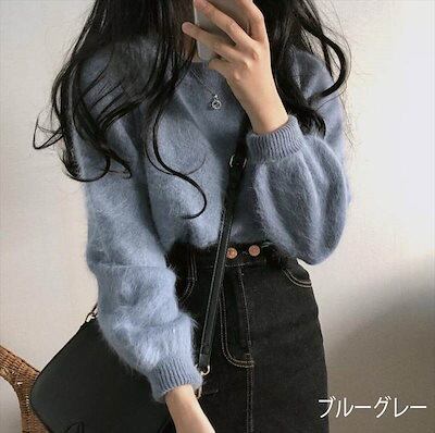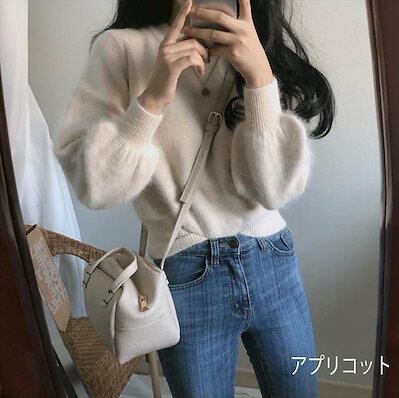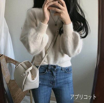 クーポン有 ふっくら 厚手 モヘア レディース トップス ニット セーター クロップド丈 長袖 ボリューム袖 萌袖 バルーン袖 Uネック 襟なし ノーカラー オーバーサイズ フェミニン 立体感 かわい