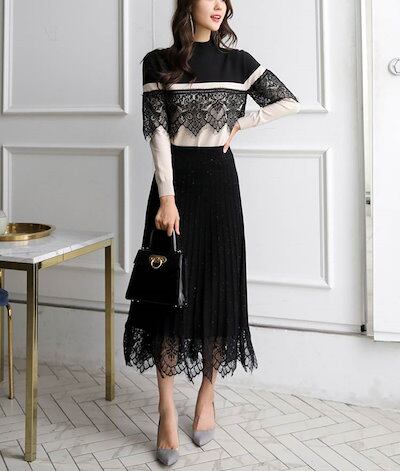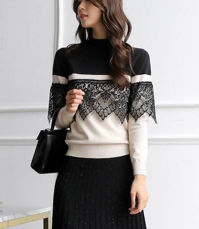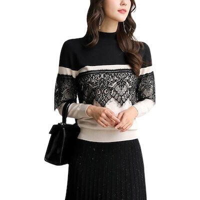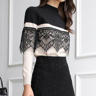 クーポン有モックネック 切り替えデザイン レディース トップス カットソー セーター 長袖 萌袖 襟なし ノーカラー スリム 細身 ストレート Iライン フォーマル スマート フェミニン 立体感 透け