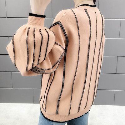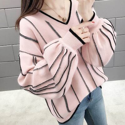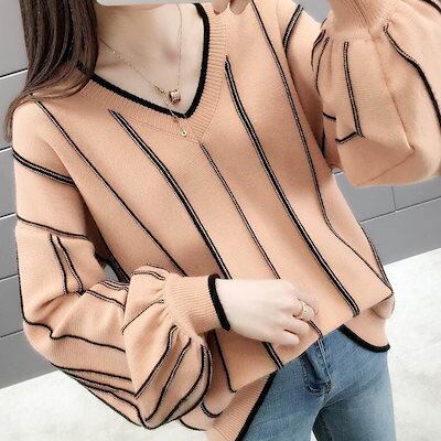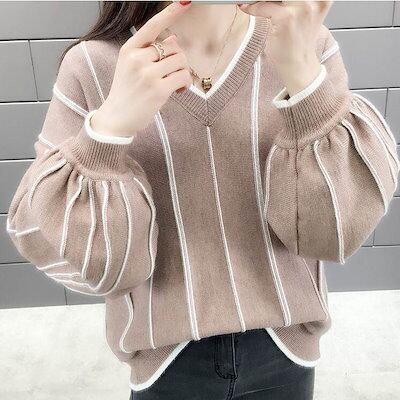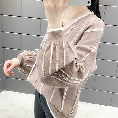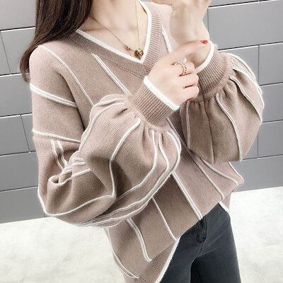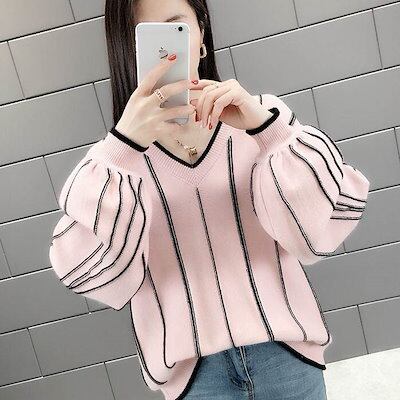 クーポン有Vネック ニット セーター トップス レディース 個性的 秋 冬 普通丈トップス 裾イン 長袖 ボリューム袖 ドロップショルダー 襟なし 鎖骨きれい 伸縮性 カラバリあり アプリコット ピン