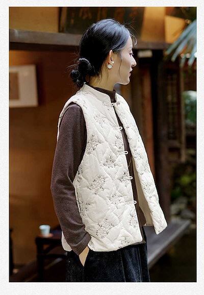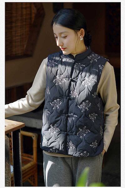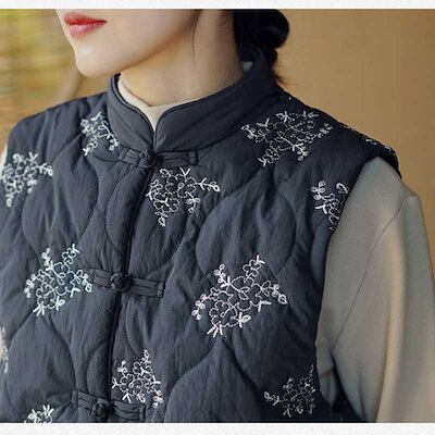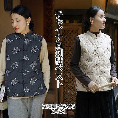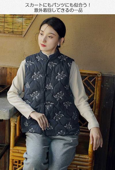 【2点購入25O円OFF】中綿ベスト レディース 洗濯機可 総柄 コート チャイナボタン ノースリーブ 中綿 ベスト ボタン 前開き ジレ スタンドカラー 民族 トップス 重ね着 エスニック 羽織り