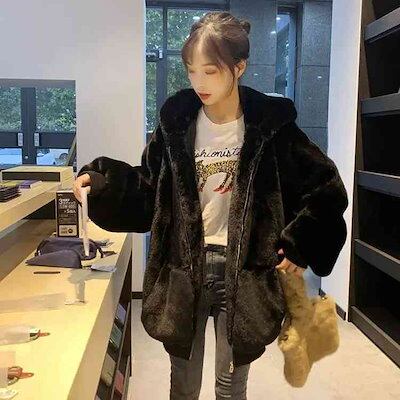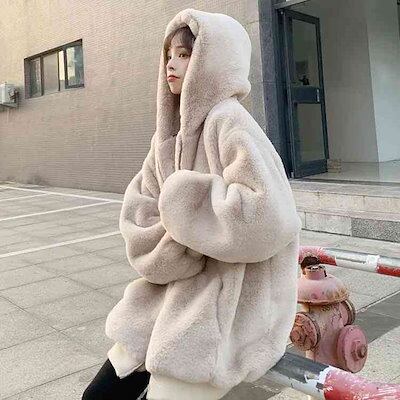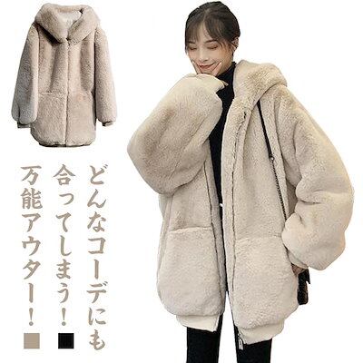 【迅速出荷】通勤 ふわふわ ボアコート フード付き レディース ボアジャケット アウター ボアパーカー 無地 ビッグシルエット ミディアム丈 ブルゾン 毛皮コート フェイクファーコート もこもこ ボア