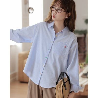 【会員専用 8% off】ストライプカラーボタンリボン刺繍 開襟 長袖 シャツ レディース 開襟シャツ 上着