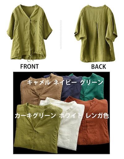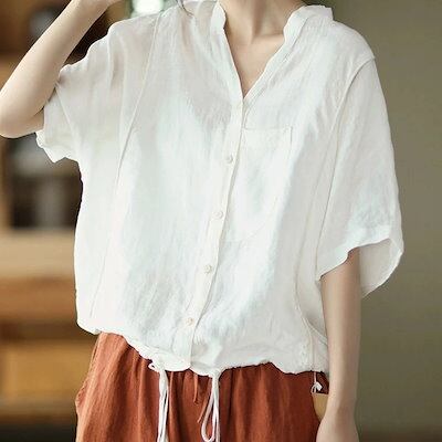 半袖シャツ シャツ ブラウス レディース 半袖ブラウス 白シャツ Vネック 半袖 春夏 前開き ボタン 立ち襟 ポケット付き 無地 シャツブラウス 裾紐付き 大きいサイズ ゆったり トップス 体型カバ