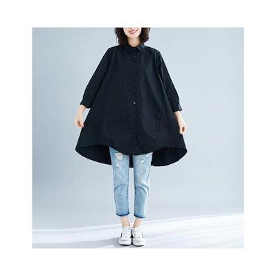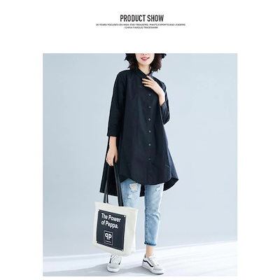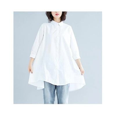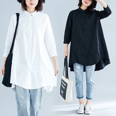 シャツロングシャツフレアレディーストップスチュニック長袖綿麻混コットンリネンAライン無地ボタン付き白ホワイト大きめ