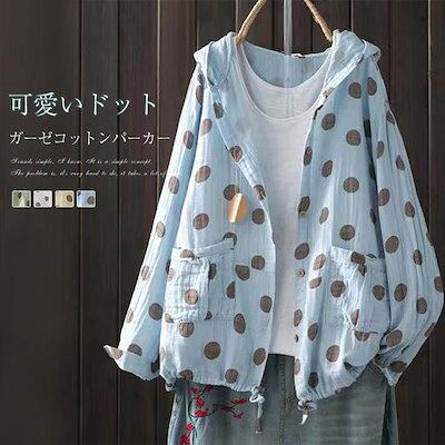 ガーゼ パーカー レディース 長袖 ダブルガーゼ パーカー 総柄 ドット ボタン ガーゼパーカー ガーゼカーディガン 前開き フード付き シャツ ブラウス トップス ジャケット カジュアル ナチュラル