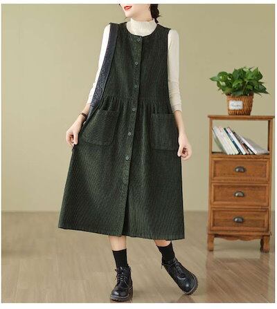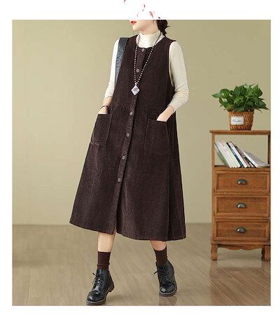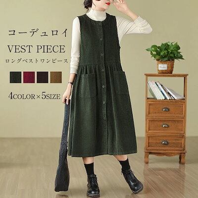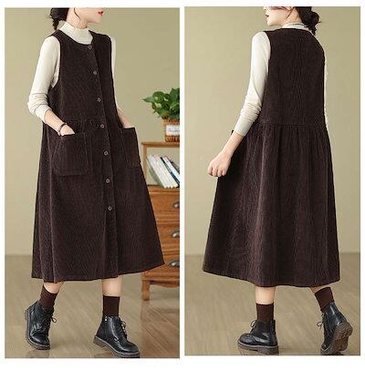 【2点購入25O円OFF】ワンピース ジャンパースカート レディース 秋 冬 ロングベストワンピース レイヤード コーデュロイ 羽織り ボタン留め ジャンスカ ラウンドネック ロングワンピース ワン