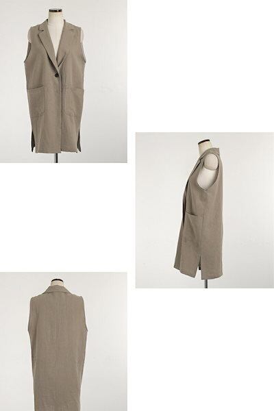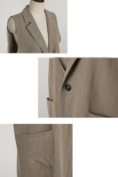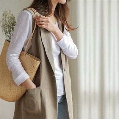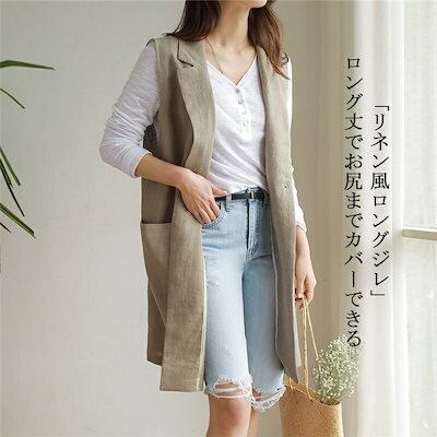【2点購入25O円OFF】ジレ レディース 春夏 ベスト 前開き ロングジレ ロングベスト リネン 大きいサイズ 麻 綿麻 ポケット折り襟 開襟 ボタン飾り スリット入り ゆったり カーディガン ノ