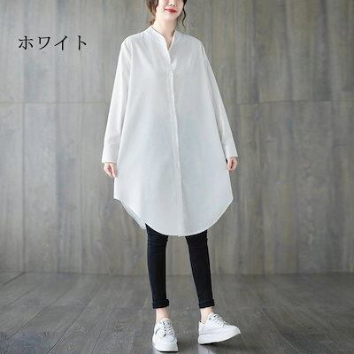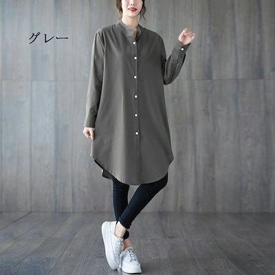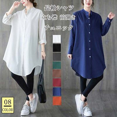 チュニック シャツ レディース 綿 ロングシャツ 長袖 立ち襟 長袖シャツ 前開き 綿混 トップス 無地 羽織り 長袖チュニック ボタン タック ゆったり 体型カバー カジュアル シャツブラウス きれ