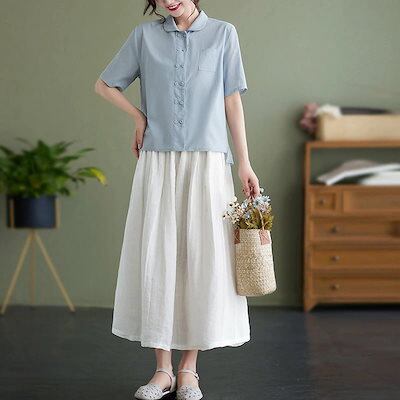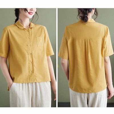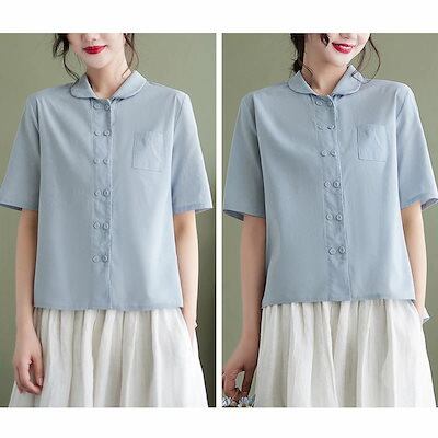 半袖シャツ レディース 襟付き シャツ ブラウス 半袖 シャツブラウス トップス 夏 半袖ブラウス 前後差 スリット 白シャツ 綿混 無地 シャツ チビ襟 ダブルボタン 大きいサイズ ゆったり 体型カ