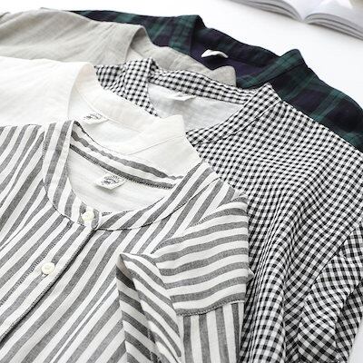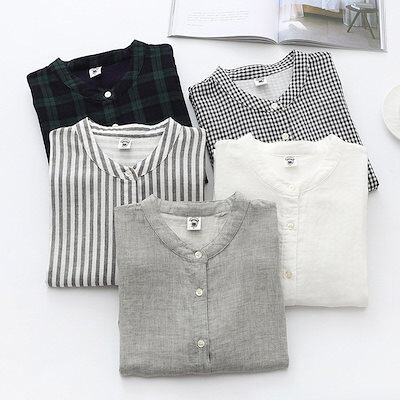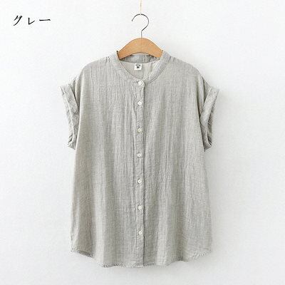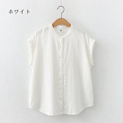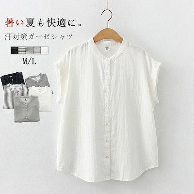 シャツ 夏 ガーゼ ブラウス レディース トップス ノースリーブ 無地 ホワイト コットン 綿 柔らか ストライプ柄 チェック柄 シンプル 立ち襟 ボタン留め 通気性 大きいサイズ 半袖シャツ 通勤