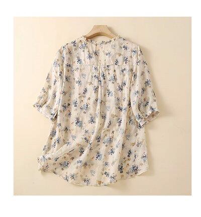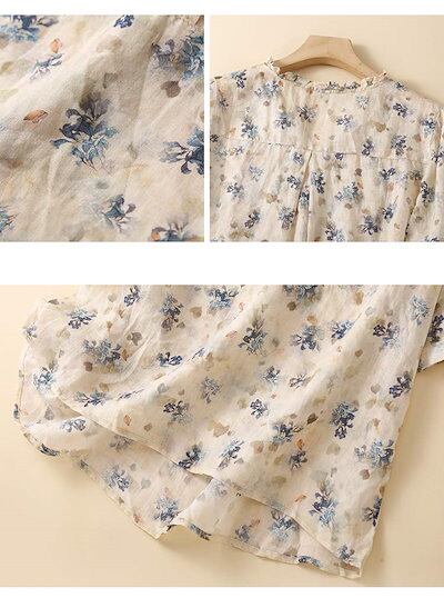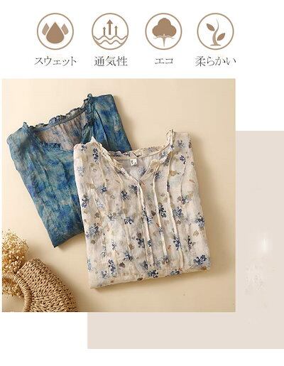 リネン シャツ ブラウス 半袖 レディース シャツブラウス 大きいサイズ Vネック 五分袖 フリル 夏ブラウス 麻100% タック入り ボタン プルオーバー ゆったり ふんわり 薄手 トップス 花柄