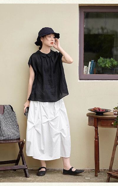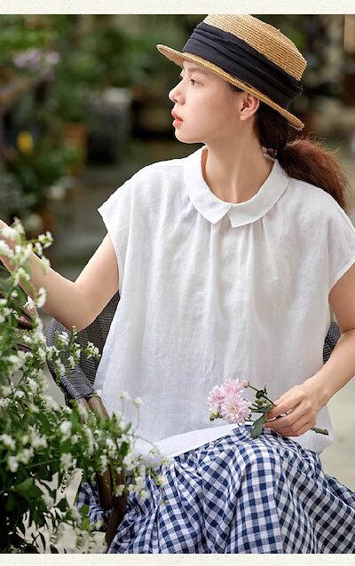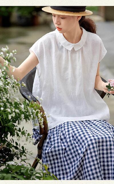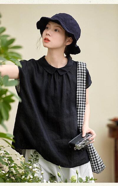 シャツ ブラウス レディース リネン コットン 半袖 春 夏 秋 シャツ バックボタン 丸襟 トップス 綿麻 無地 ナチュラル フェミニン 着回し シンプル おしゃれ 大人 カジュアル こなれ感 体