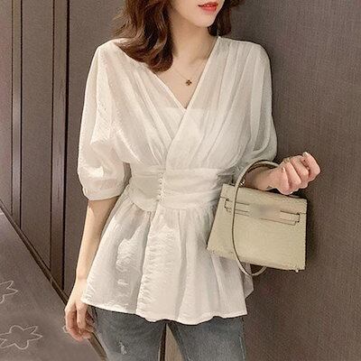 人気の新作 シースルー ブラウス おしゃれ レディース 夏 きれいめ トップス 半袖 5分袖 ボタン 和風 ハイウェスト Vネック black white 黒 白 大人可愛い涼しげ シャツ Tシャツ