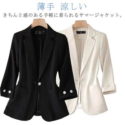 サマージャケット レディース 薄手 テーラードジャケット 7分袖 スリム フィット パールボタン カジュアル 裏地なし 軽い 涼しい 春 夏 おしゃれ ビジネス 通勤 アウター 夏 オフィスカジュアル