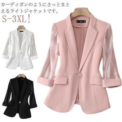 サマージャケット レディース テーラードジャケット 袖透け感 7分袖 ミドル丈 無地 薄手 冷房対策 ビジネス スーツ フォーマル アウター トップス カジュアルジャケット 羽織 上着 カーディガン