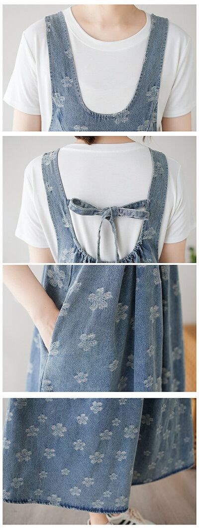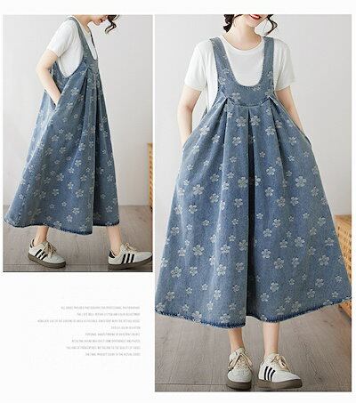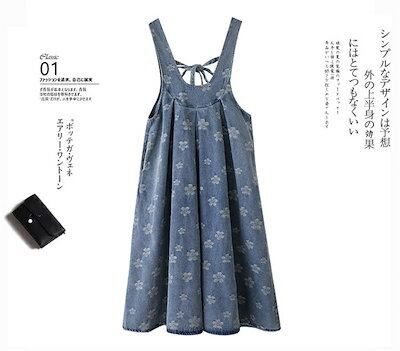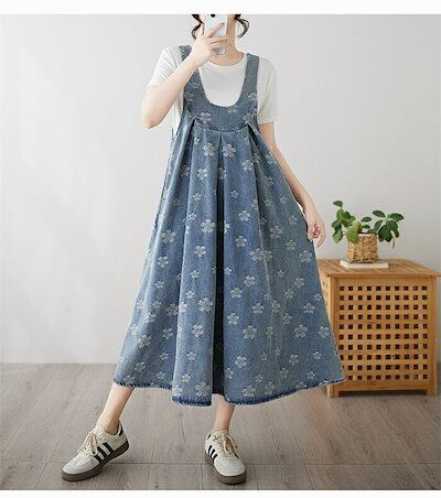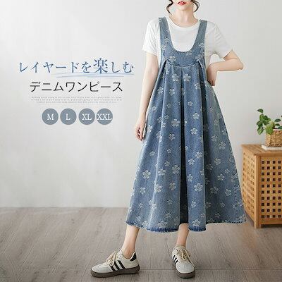 売切必至サロペット ワンピース デニム ジャンパースカート オーバーオール オールインワン デニム ワンピース ロング丈 ノースリーブ 体型カバー レディース ワンピース 春 夏 秋 花柄 Uネック