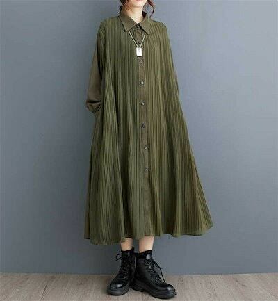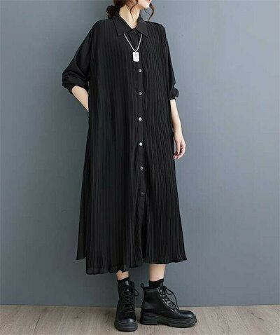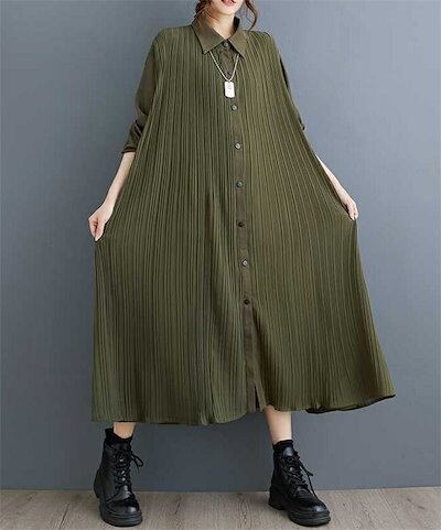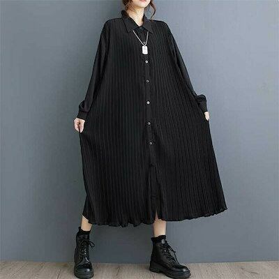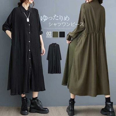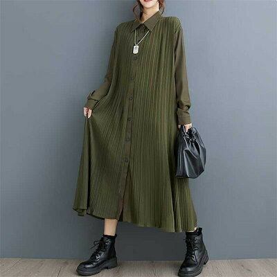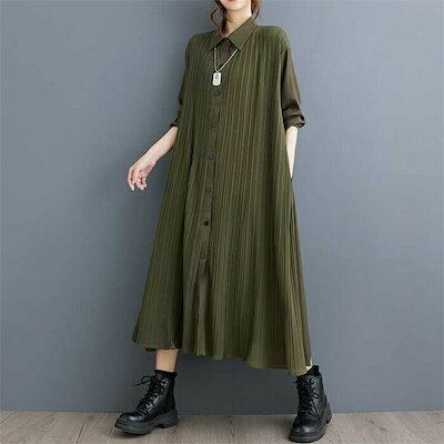 リピーター続出シャツワンピース 秋 春 長袖 ロング ワンピース レディース 長袖 プリーツワンピース シャツワンピ ロングワンピース ミモレワンピース フレアワンピース フレア Aライン 無地 ゆっ
