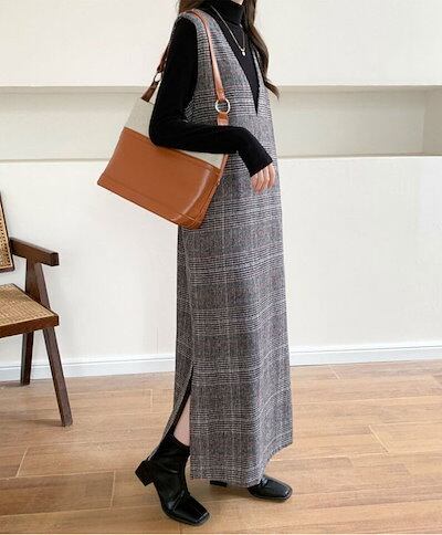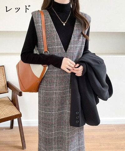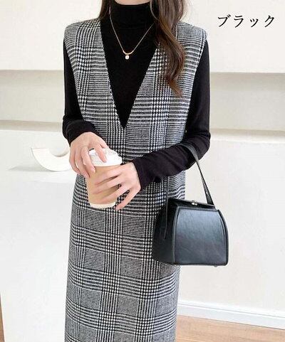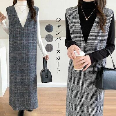 お急ぎくださいジャンパースカート マキシ丈 Vネック チェック柄 ロング 秋 冬 大人 重ね着 レイヤード オールインワン レディース ロングワンピース ロングベスト ワンピース ジャンスカ スリット