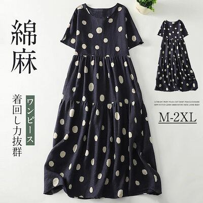 【人気商品超目玉】ロングワンピース 綿麻混 ドット柄 水玉 ティアード レディース きれいめ 春 半袖 夏 大きいサイズ ガーゼ ロングワンピース ロング コットンリネン 綿麻ワンピ ロング丈 Aライ