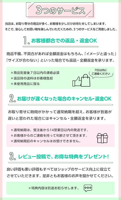 サイズ交換、お色交換などの返品、交換は行っておりませんので十分にお確かめの上、ご購入お願い致します。