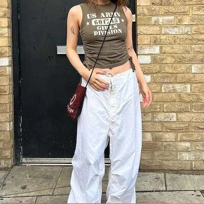 【急速出荷!】25 ウエストゴム ハイウエストカーゴパンツ ボトムスワイドパンツベイカーパンツストレートゆったりルーズ 韓国カジュアルスポーティーメンズライクレディースファッション