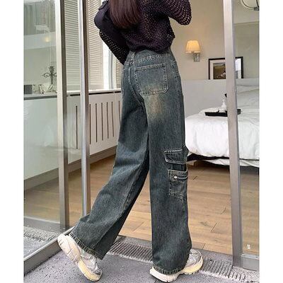 【急速出荷!】ワイドパンツ ウォッシュデニムカーゴパンツ レディース