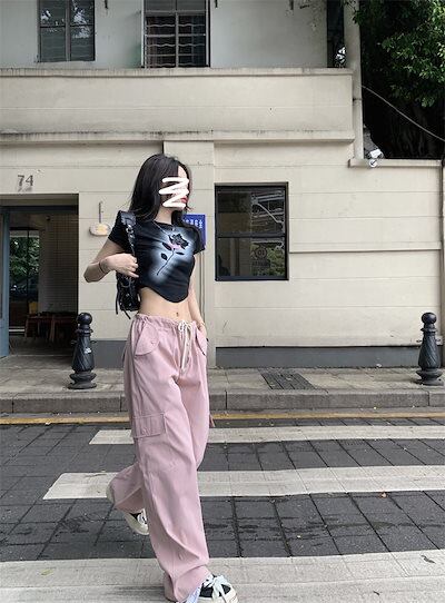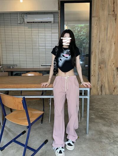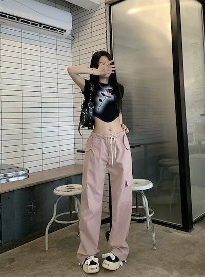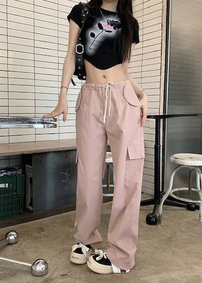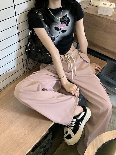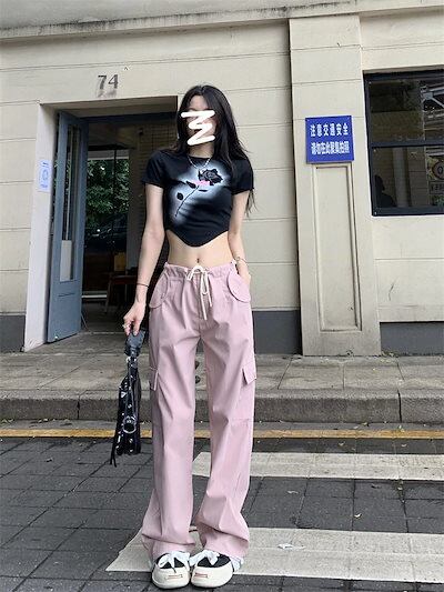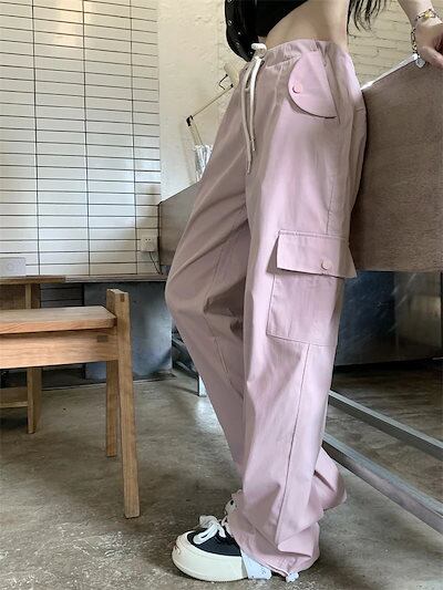 かっこいいスラックスパンツカーゴワイドパンツマルチポケット オーバーオール レディース ピンク シンプルハイウエストストレートワイドレッグパンツズボン 無地 襟無 ファッション おとなっぽい