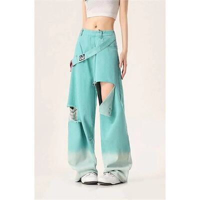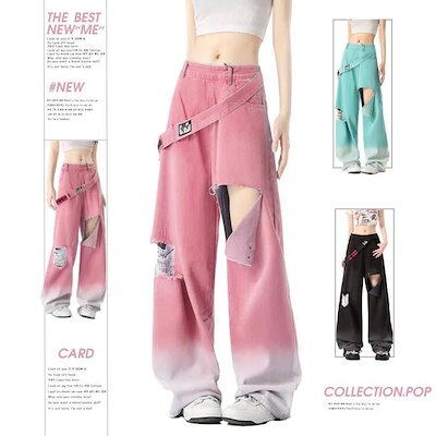 新品登場 カーゴパンツ デニム レディース ダンス衣装 ピンク ブルー ブラック ダメージパンツ ジンズ ステージ用パンツ おしゃれ かわいい kpop ハイウェイスト おしゃれ30パーセント限定
