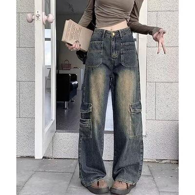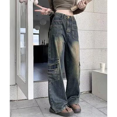 ワイドパンツ ウォッシュデニムカーゴパンツ レディース