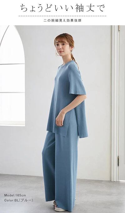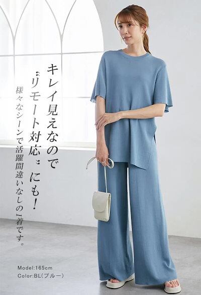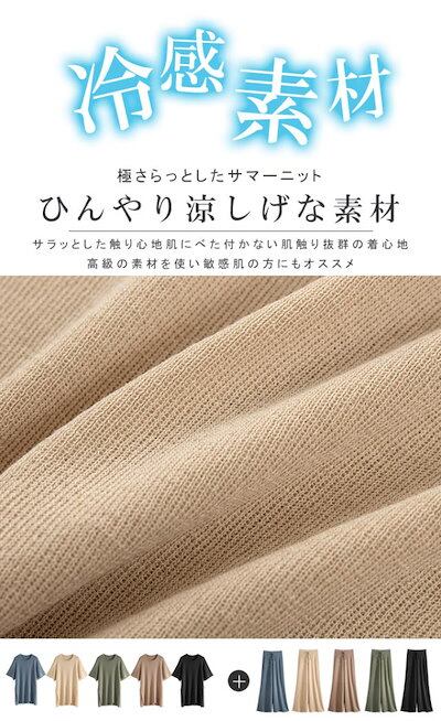 カレイkarei セットアップ レディース 半袖 冷感素材 Tシャツ サマーニット ワイドパンツセット ガウチョパンツ スリット入 01OS7813-1