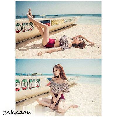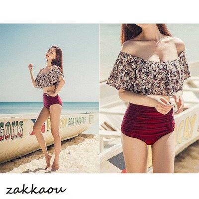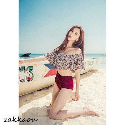 ビキニ水着レディース 夏 ビキニ2点セット 韓国風 花柄 ボートネックビキニ 水着 セパレート 40代 可愛い スイムウェア 温泉 ママ水着