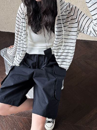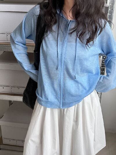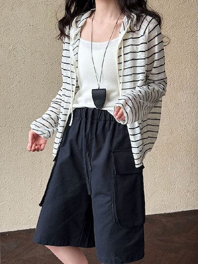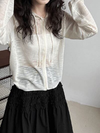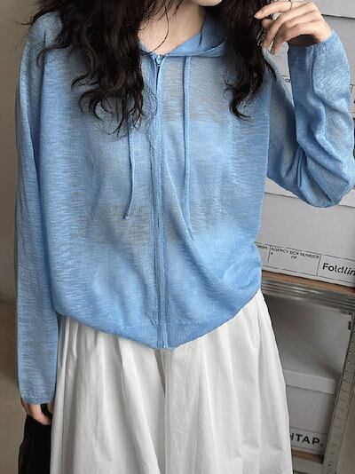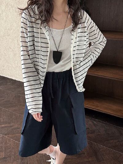 カーディガン サマーニット フード付き パーカー 長袖 レディース 春 夏 秋 さっと羽織れる 透け感 ゆったり フェミニン 着回し ベーシック 高見え 無地 ボーダー柄 長袖 薄手 カジュアル 体型